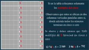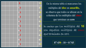 Además de permitirnos determinar con facilidad cuáles números son múltiplos de cinco o diez, el hecho de compartir columnas nos permite obtener algunas conclusiones: