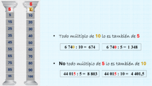 - Dividir un número entero por cinco equivale a multiplicarlo por dos y dividirlo por diez (corriendo la coma un lugar a la izquierda).